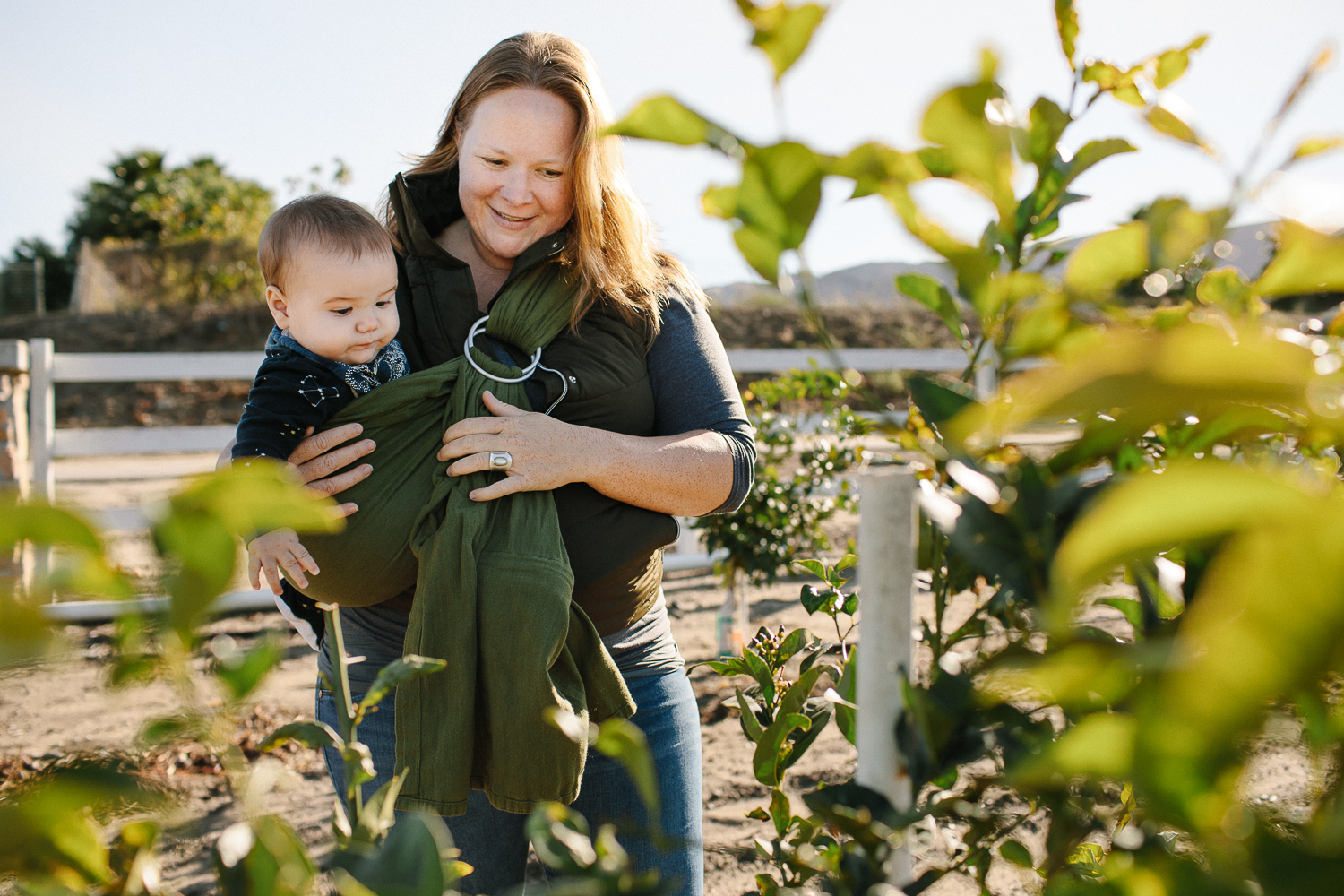 Helen McGrath with her son Pedro in front of baby lemon trees on Flying M Ranch in Fillmore, Ventura County, California. Photo Credit: Stella Kalinina