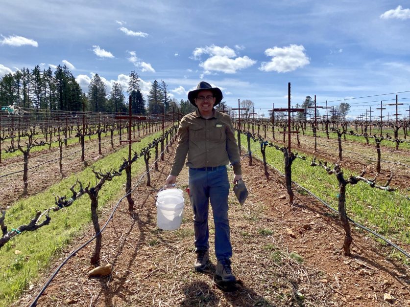 MIguel collecting soil samples in Napa County to assess soil health indicators and inform management decisions that support long-term agricultural resilience.