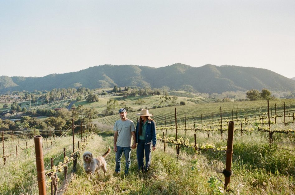 Mikey and Gina Giugni walk their Bassi Vineyard property in Avila Beach, where they have implemented climate-smart practices to create pollinator habitat, sequester carbon, and mitigate wildfire risk. Photo by Summer Staeb.